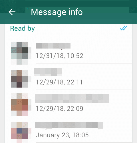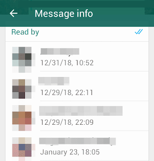 - الان تظهر لك قائمة بجميع من شاهد الرسالك الخاصة بك في مجموعة whatsapp وتاريخ ووقت المشاهدة.